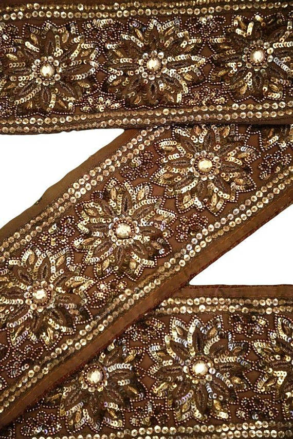 I started trying to locate a suitable center fabric. After several samples came and were dismissed, the same person that posted the original idea suggested a wide trim. I started looking at trim and found a lovely 4 inch wide, vintage, brown sari border on Etsy.