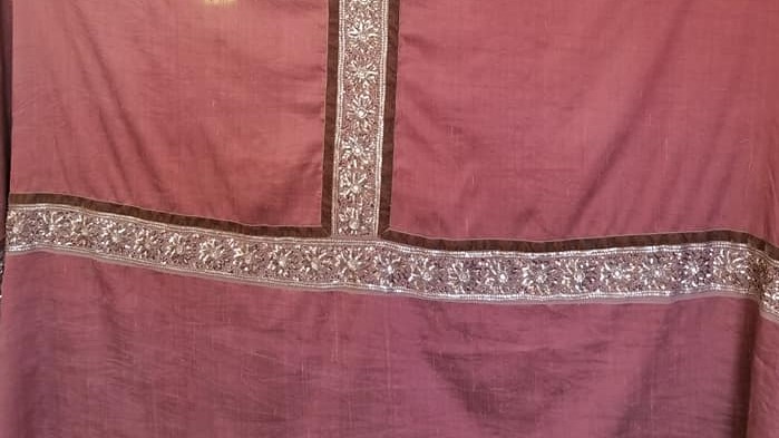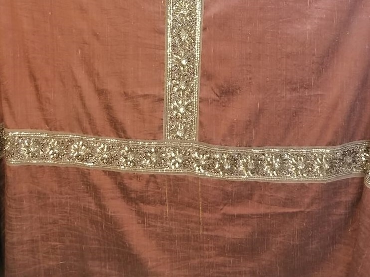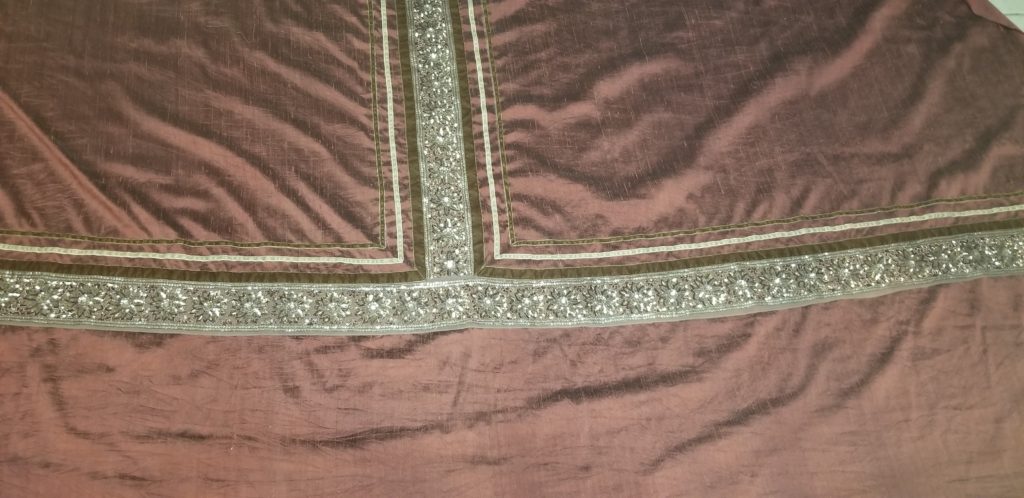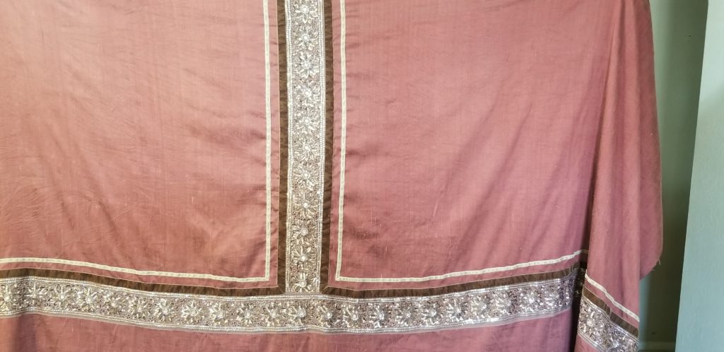 As my wife and I had long suspected would be the case, it looked a little incomplete. Another row of thick brown trim below the beaded and spangled trim seemed to even that out. This row was quite a bit easier since it just lined up with the spangles on the center trim. Once that was on, the skirt trim was completed. I will still have to French seam the back seam and then gather it to the skirt and hem it to length, but the exacting trim part was done.