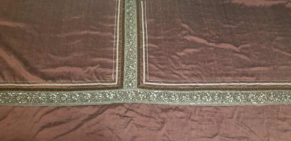 Again, carefully pinning my trim down and stitching on this chalk line completed the third stripe of trim.
