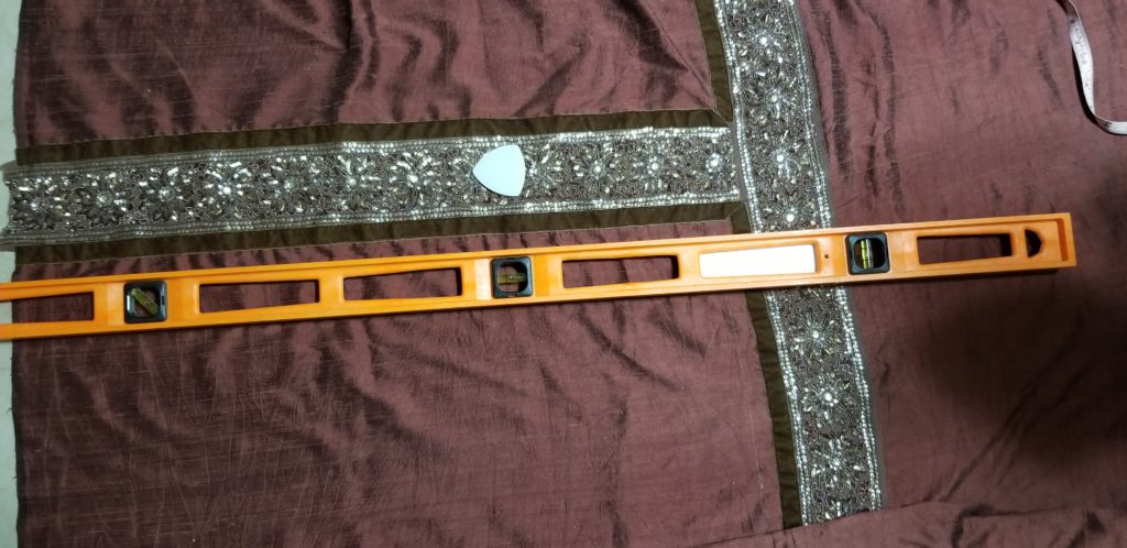 The trim for this skirt is not all bunched up next to each other but is laid out with gaps between the various rows. This means I needed to be very precise with my trim to keep my lines appearing straight and evenly spaced. I had a large amount of help with this. My wife, with her artist’s eye and touch, helped lay my guidelines.