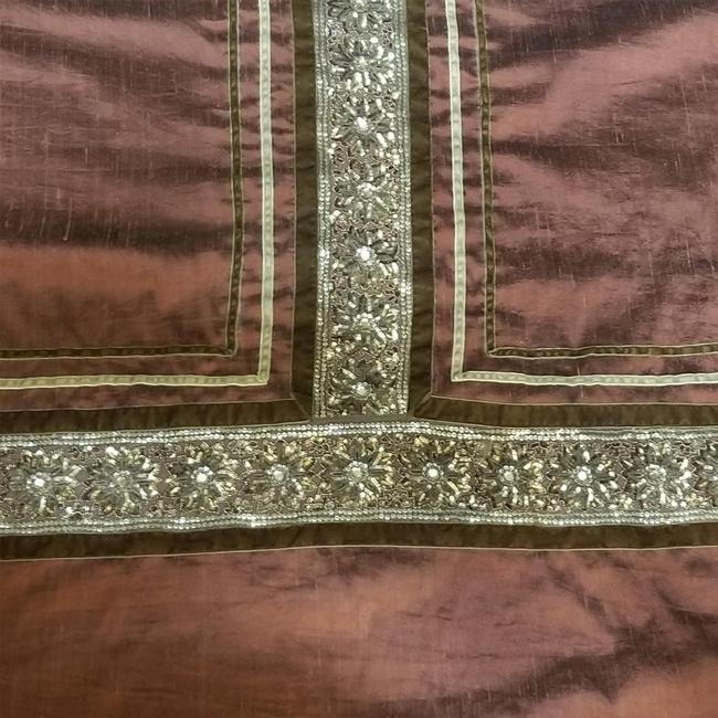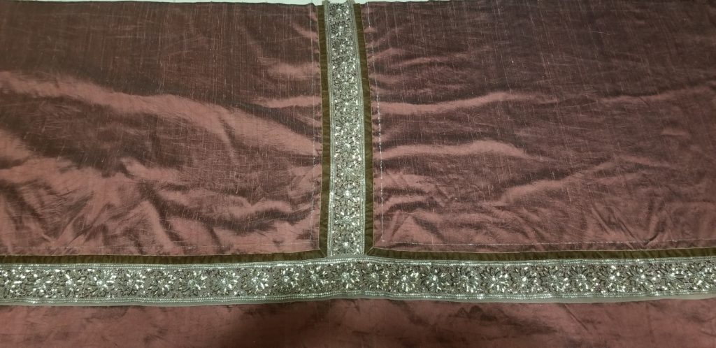As my wife and I had long suspected would be the case, it looked a little incomplete. Another row of thick brown trim below the beaded and spangled trim seemed to even that out. This row was quite a bit easier since it just lined up with the spangles on the center trim. Once that was on, the skirt trim was completed. I will still have to French seam the back seam and then gather it to the skirt and hem it to length, but the exacting trim part was done.