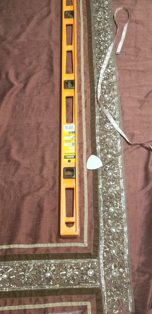The trim for this skirt is not all bunched up next to each other but is laid out with gaps between the various rows. This means I needed to be very precise with my trim to keep my lines appearing straight and evenly spaced. I had a large amount of help with this. My wife, with her artist’s eye and touch, helped lay my guidelines.